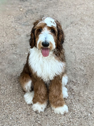 Ahsoka is a self assured, sweet natured, affectionate, and joyful dog. She is great with kids and loves everyone she meets. She loves cuddling and giving gentle hugs. She is the daughter of our foundation stud, Mando. She is co-owned by Daisy Mountain Doodles. She lives with a guardian family in the valley. Her legacy will be carried forward in our program by her son, Bruin.