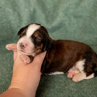 Bruin has a phenomenal temperament. He is easy going, social and super affectionate. He is in training to be a therapy dog. Bruin is a "clear" sable tuxedo and has the most soulful brown eyes. He literally looks like a cartoon dog! He is the son of our mama, Ahsoka & the grandson of our foundation papa, Mando. He lives with a guardian family in the valley.